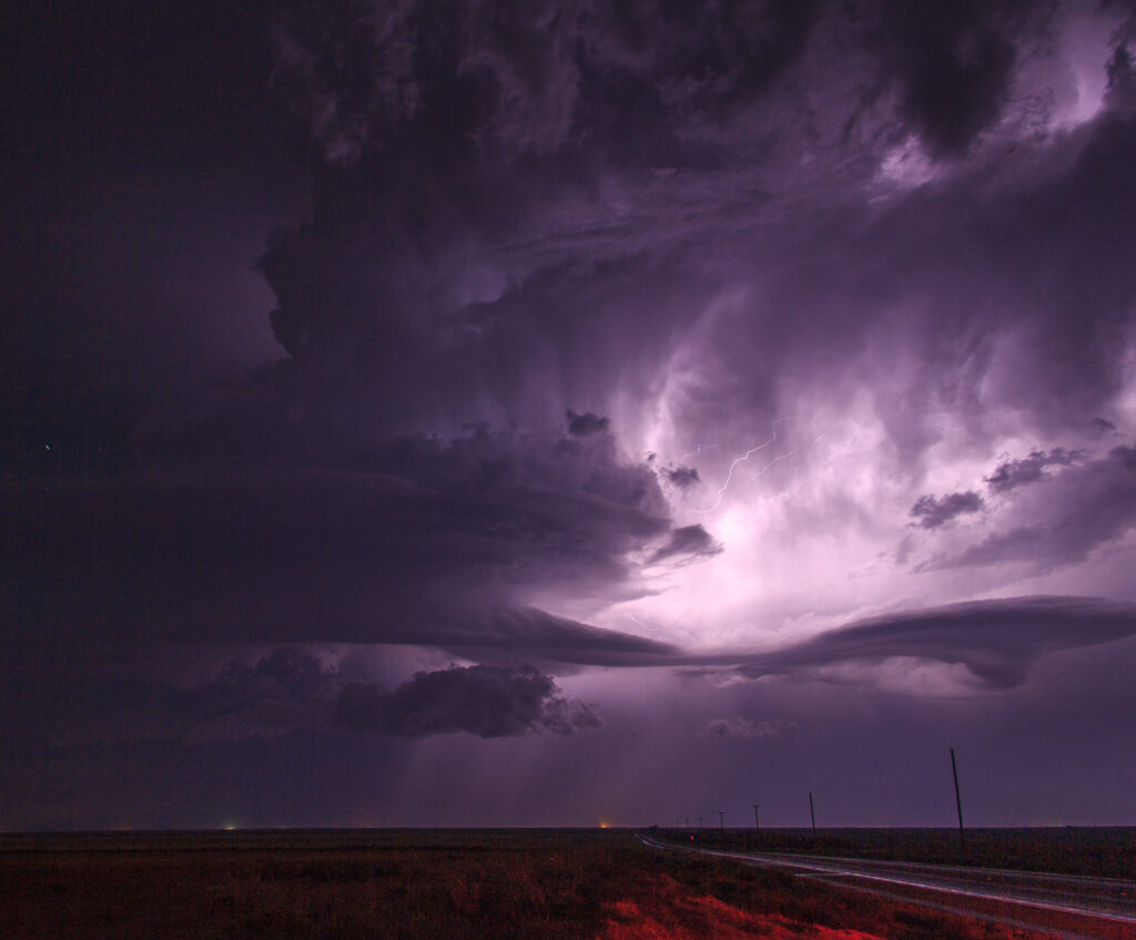 We continued down to the town of Goldsmith just north of Odessa where we setup under an overhang for the storm to blow in. It shielded us from most of the hail, and the oil rig burn off of natural gas blew up huge in the winds from the storms which illuminated everything while the storm blew in.