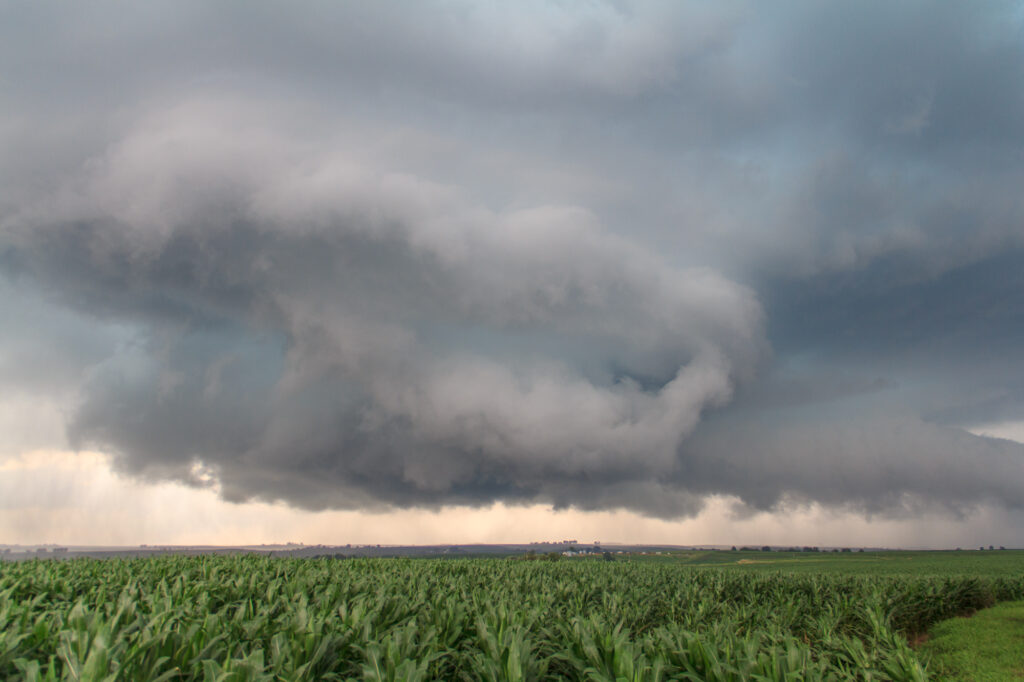 As we continued east on highway F58/296th Street, we eventually witnessed a very brief and small funnel which apparently touched down briefly. We continued east until US59 where the storm really started falling apart again. The traffic by this point was insane, with a huge line of cars coming down F58. We decided to bail north to Harlan and then east into the core to Kimballton before dropping back south in front of everyone again.