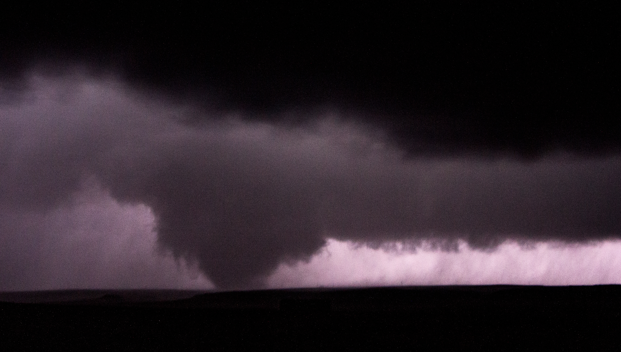 The only way out was back the way we came. Back north on 207 we went when Lindsey started yelling “Funnel funnel funnel!” Sure enough an elongated slender cone funnel had come down and almost touched down. I pulled over and recorded tornado #1 just before sunset.