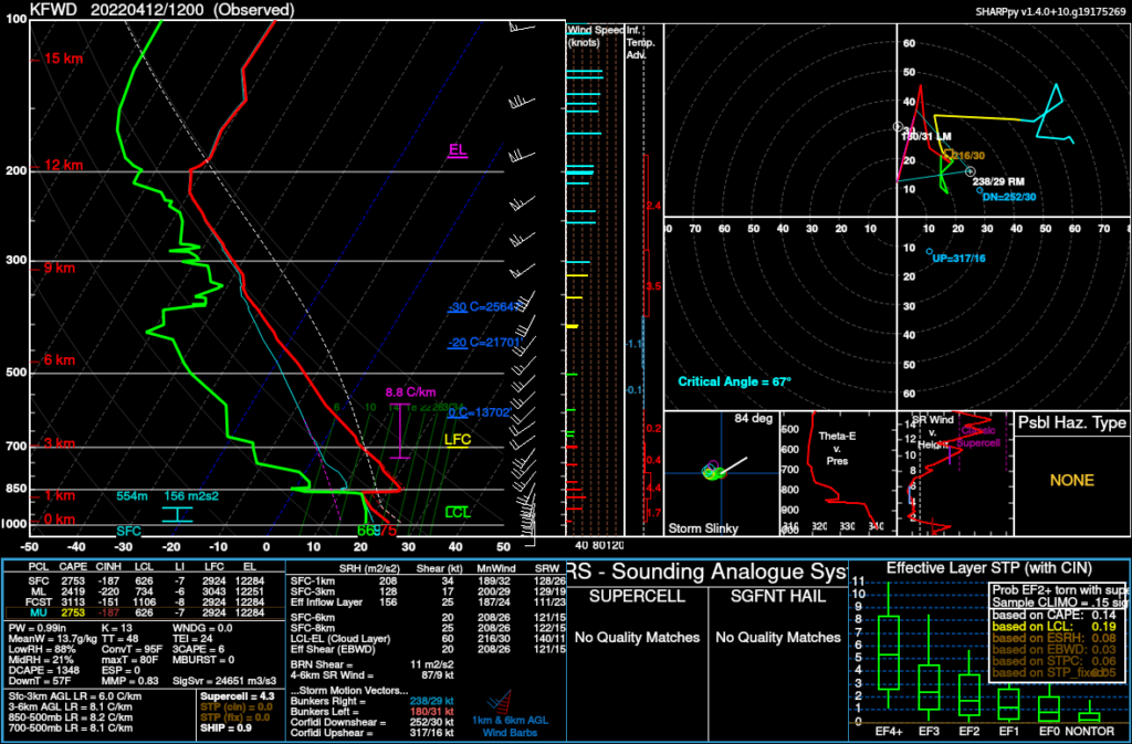 I slept in Tuesday morning and had no sense of urgency. Eventually I did a forecast and realized there was a wave coming in over Mexico. It was very evident in water vapor. Moisture had most definitely arrived, evident in the 12Z Fort Worth sounding. Lapse rates were steep, over 8 C/km.