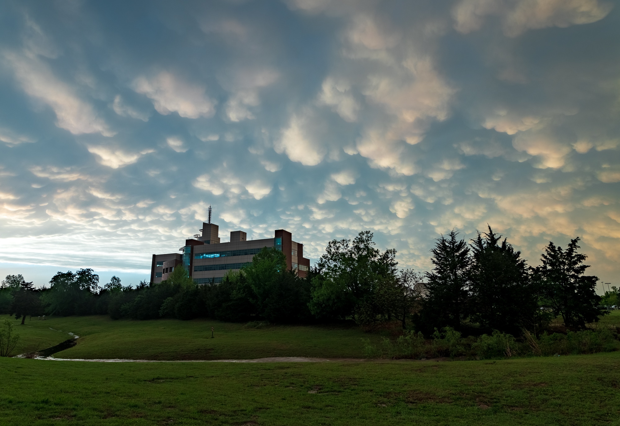 As we returned to Norman, we were presented with an insane display of mammatus. I stopped off at the Weather Center and parking garage on campus to get some photos of both the mammatus and the anvil crawlers on the backside of the MCS.