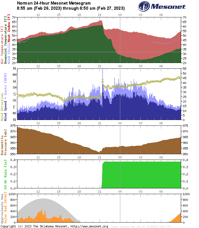Note the increase in shear from 00Z to 03Z (6 to 9pm CST) soundings. As the upper level trough as well as the line of storms approached Oklahoma City, we saw a double of the low level shear values. The thermals still show a strong capping inversion, but that did not matter. Here is the Meteogram from the Norman mesonet station.